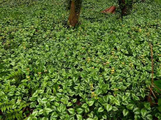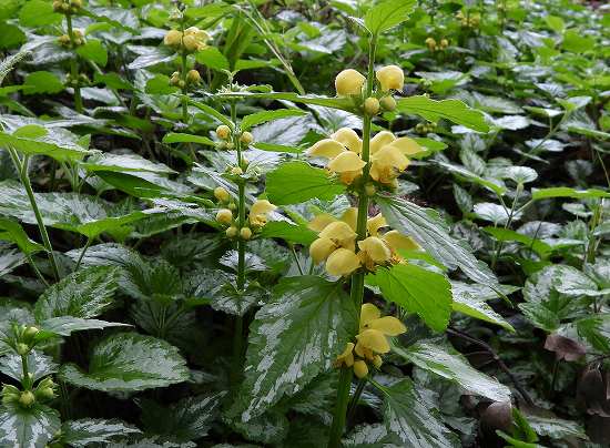いつもの散歩道に沿う森の縁に、何時の頃からかこのキバナオドリコソウが群生するようになっていました。1本、2本だと左程目立たない花ですが、こうして群生していると圧巻です。 花は黄色の唇形花で、上部の茎を取り囲むように輪生しています。上唇と下唇は大きく開き、上唇は笠のようになっていて、この花が、この笠を被って踊る踊り子に見えるところからオドリコソウの名が付けられました。そう思ってこの群生している花を見ますと、道幅いっぱいになって踊り歩く阿波踊りなどの踊り子さんの姿を思い浮かべてしまいます。 写真の黄花はヨーロッパ原産で、日本には園芸種として移入されたものですが、それが逃げ出したものと思われます。この斑入りの葉などいかにも園芸家好みのようです。日本の在来種のオドリコソウは花の色が白から淡い紅紫色で、北海道から九州まで分布しています。 分類 シソ科 オドリコソウ属 多年草 分布 ヨーロッパ原産 北海道~九州 林縁 花期 3~6月 高さ 30~50㎝ ![]() ![]() |
